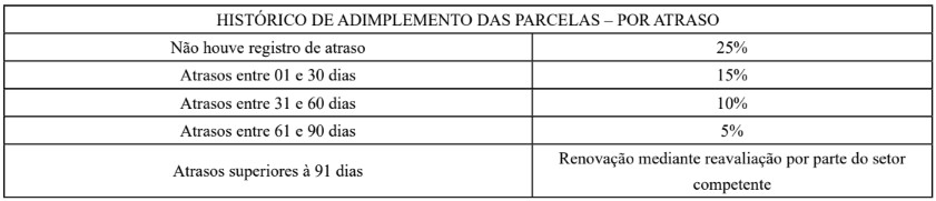 Os valores da renovação seguirão uma lógica sistemática, na qual o valor base será sempre o valor liberado no último contrato liquidado, havendo um acréscimo gradativo, tendo como base o histórico de adimplemento das parcelas do tomador final de recurso, conforme tabela a seguir: